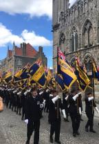On the morning of Wednesday (August 8th) we assembled outside the town of Ypres for a parade which would finish at the Menin Gate as it had done 90 years previously. We set off at 12.00 in ranks of 4 to march through the town square with a total of 1,150 Standard Bearers. This represented, by a significant amount, the largest number of Branch Standards ever paraded at one event. We were followed by the wreath layers in a parade that stretched well over a mile in length. We joined other Legion dignitaries Civic and military guests from the UK, Commonwealth and Northern Europe at the Menin Gate for a Service of Remembrance. After the service Sue laid her wreath on behalf of The Seale and Sands Community. The wreaths are now on public display close to the Menin Gate and will remain there until 31st August.