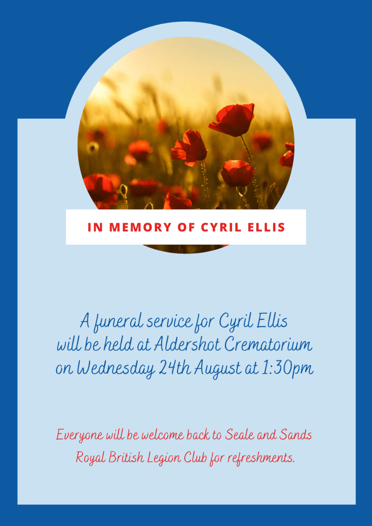 For refreshments after the service, everyone is invited back to the Seale and Sands Royal British Legion Club where we hope you’ll join us in remembering and celebrating Cyril’s life.